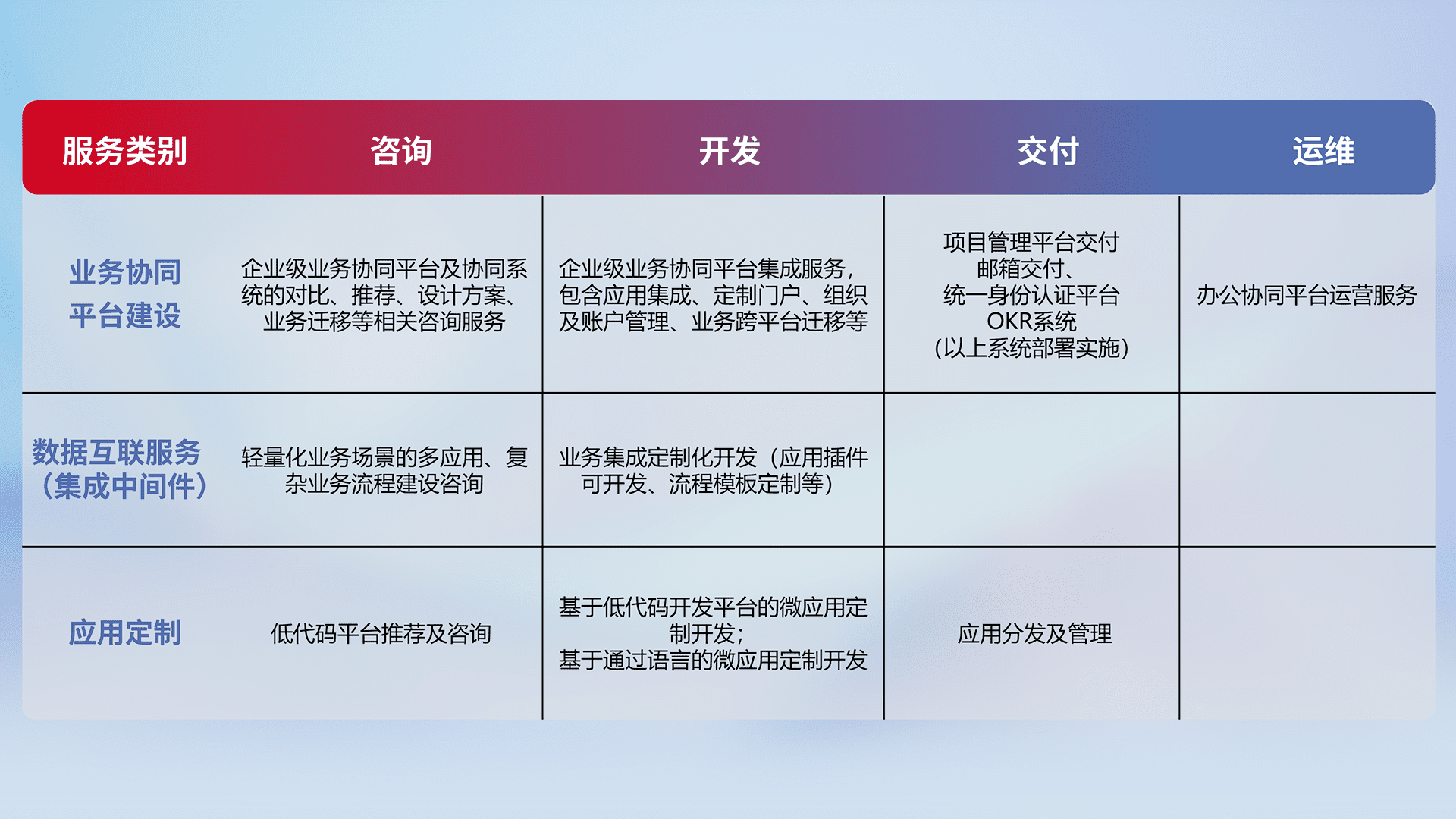 针对钉钉、、企微、、、、IDaas等平台级产品提供产品的规划、、、方案、、、、交付、、、、定制化开发等服务,,,,实现如统一协同办公、、、智能客户服务、、、、混合会议管理、、智能数据查询、、等业务场景,,,,实现数字化转型。。