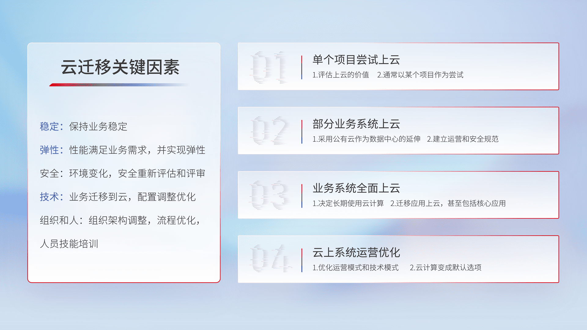 结合实际业务,,,,从规划设计、、、、云平台选型、、云原生改造、、、数据迁移、、集成交付,,,,迁移全过程为客户识别最佳上云路径,,做好风险识别管理,,设计网络架构、、身份权限、、安全审计合规、、、、操作审计、、日志审计、、监控告警策略、、多站点容灾设计等,,,对云上基础设施进行整体规划,,提升IT治理水平,,以满足弹性、、、高可用、、高性能的需求。。