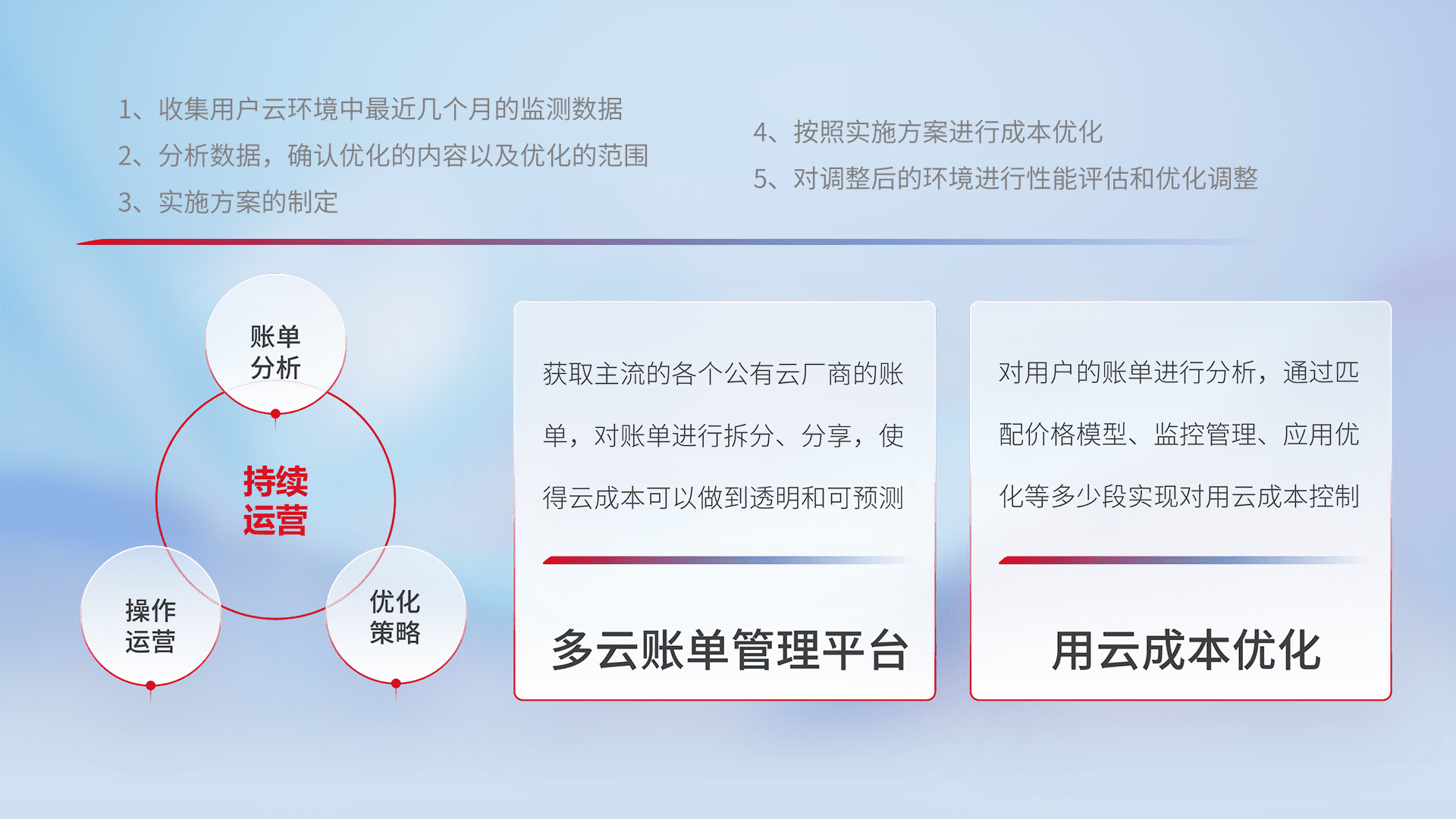 通过多云纳管,,以统一的资源数据模型把客户的云资源进行抽象和封装,,进而实现对多云资源的统一操作,,,保障云资源管理的可靠性、、、、稳定性与可用性。。量身定制化运维内容,,,,配置、、、、开发运维、、、补丁管理、、备份、、监控、、认证和访问管理、、审计和日常巡检等,,,,保障在用云过程中的可靠度,,,稳定度以及高可用率。。。。